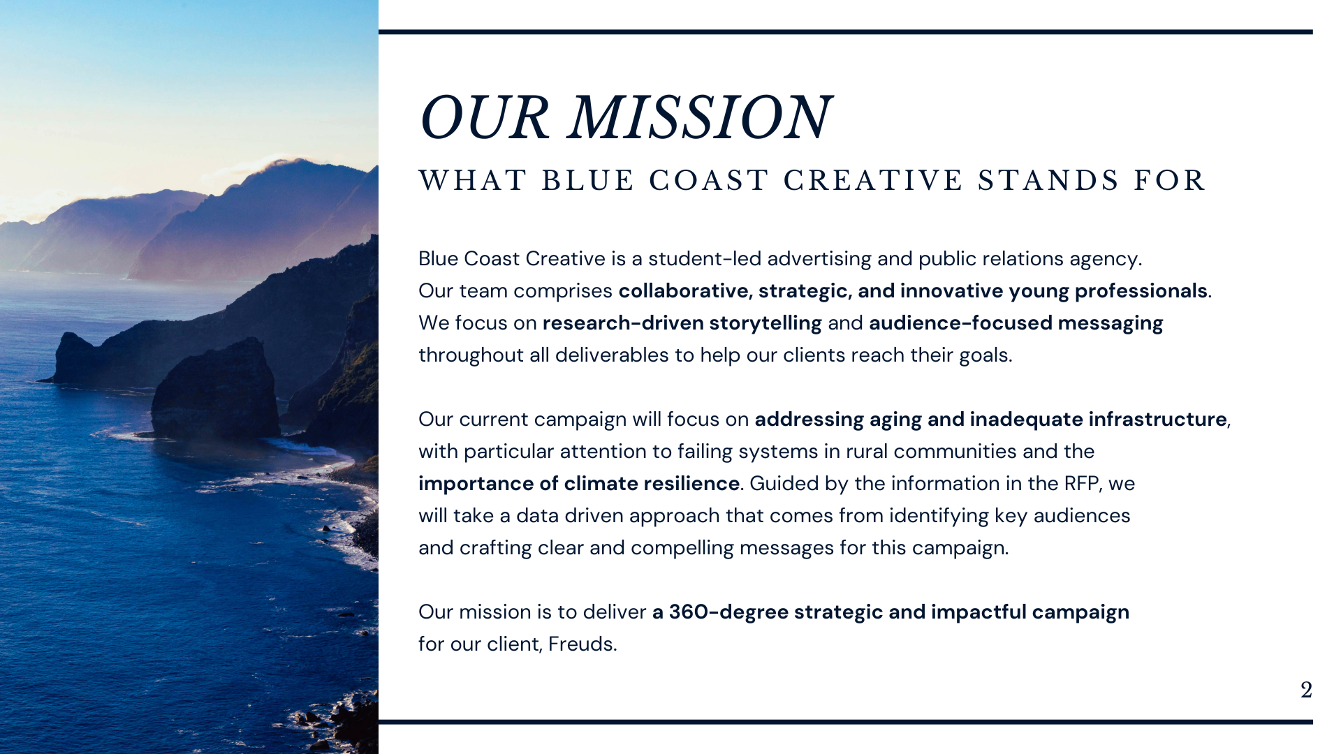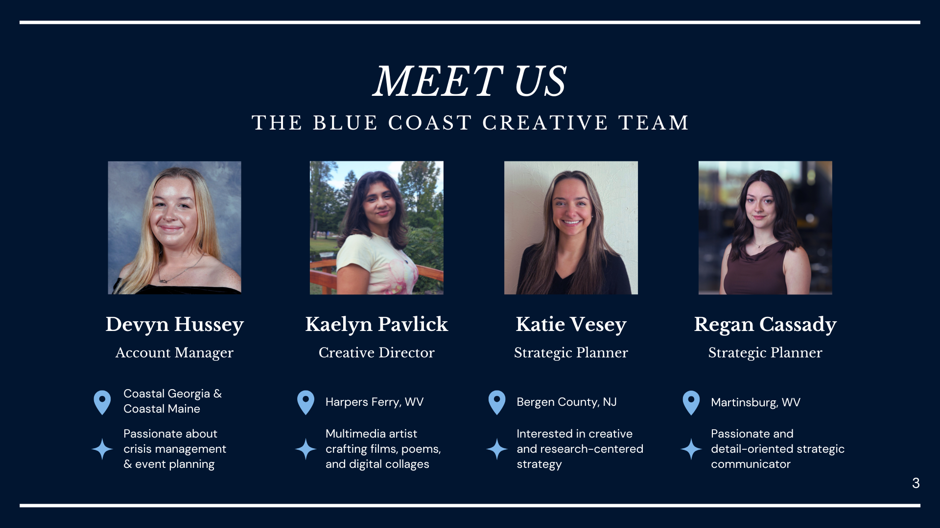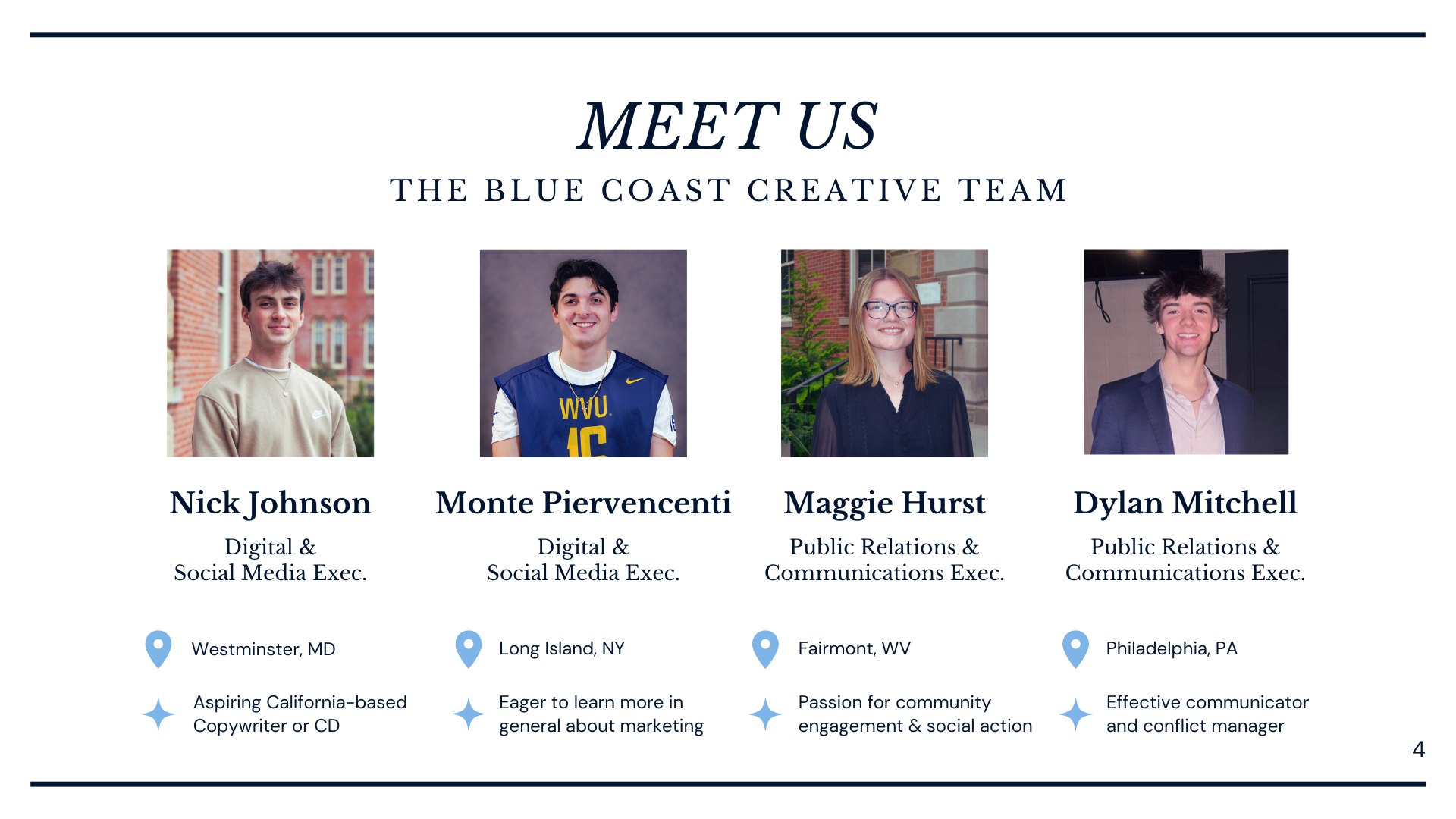 Blue Coast Creative is a student-led ad agency as a part of the Strategic Communications capstone at West Virginia University. I was tasked with crafting the brand identity for our agency, including the name, logo, and brand kit. Using this brand kit, I created a presentation that introduces the team.